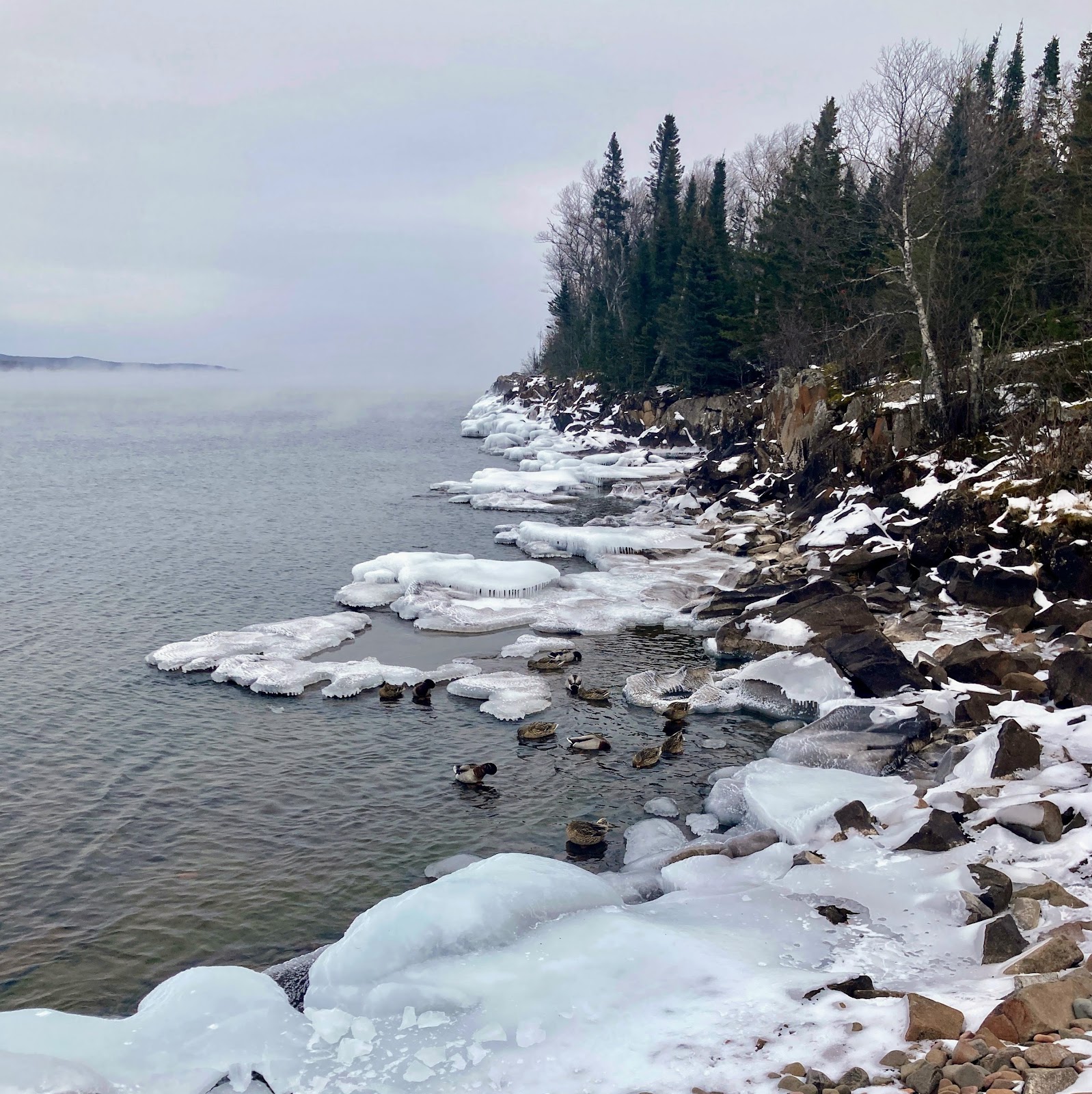 All the while, a small flock of mallard ducks bobbed on the waves in East Bay, behind the protective curve of Artist’s Point in Lake Superior. Shouldn’t they be somewhere warm? As we watched, the flock paddled toward the shore and settled in among the ice-draped rocks along the shoreline. Some dipped their bills into the shallow water, likely finding some remnants of aquatic plants to eat. Others stood on submerged rocks and preened their feathers. Both the oils they secrete and the structure of their feathers keep the cold lake out of their warm down insultation. They probably have less trouble maintaining their 100-degree body temperature than I do my 98 degrees.